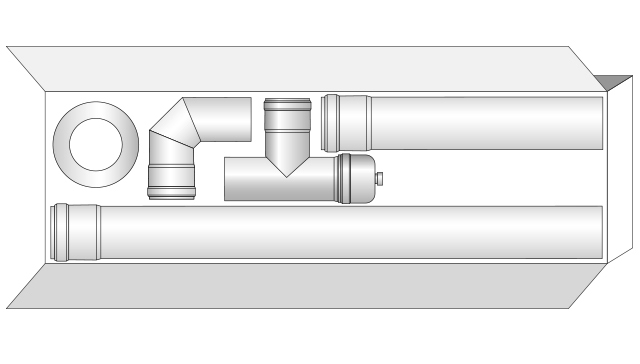 Das Einbau Kit für Pelletöfen besteht aus: - nr. 1 emailliertes gerades Element mit Dichtung h.1000 - nr. 1 emailliertes gerades Element mit Dichtung h. 500 - nr. 1 emailliertes Bogen 3 Sektoren mit Dichtung 90° - nr. 1 emailliertes T-Stuck mit Kondenswasser Grundplatter, Stopsel und Dichtung - nr. 1 emaillierte Abdeckungsring